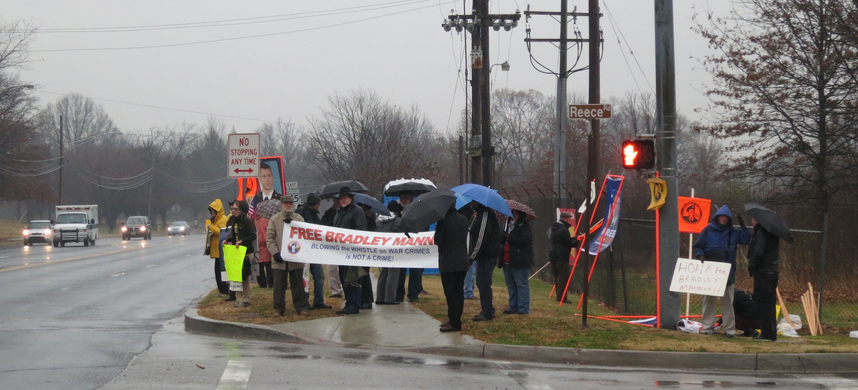 Protesters take action out in the cold rain at Bradley Manning’s November 27th hearing that addressed his unlawful pretrial punishment.