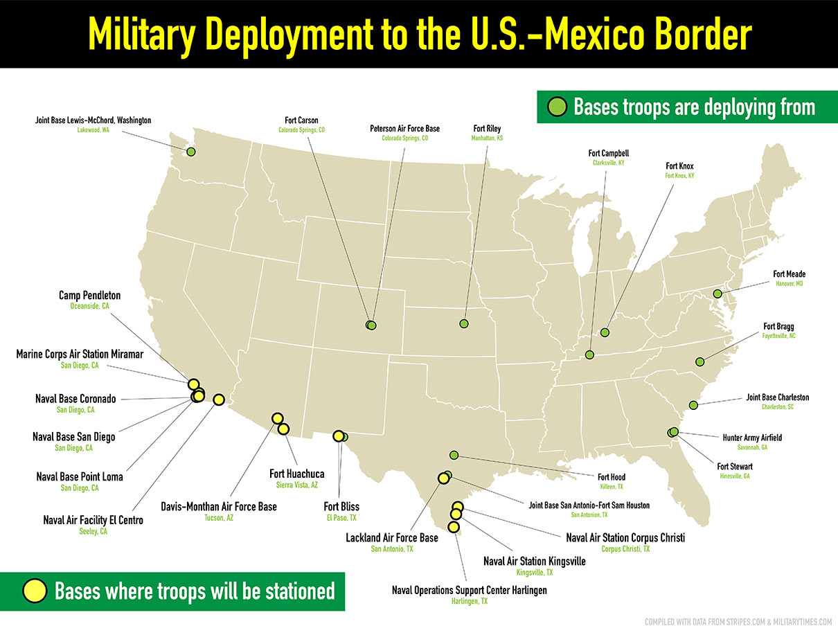 Veterans For Peace strongly condemns the recent announcement that up to 15,000 active duty military personnel may be sent to the U.S. southern border. These troops will join the additional National Guard units that were sent last year, increasing the militarization of our borders at an alarming rate. Our immigration laws and enforcement tactics have long been at a crisis point and we are now witnessing an even more draconian surge in the use of force to prop up failed policies.
